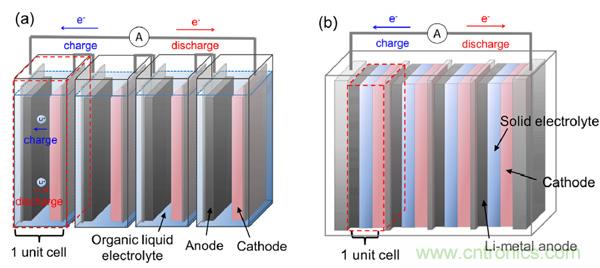 下圖對比了傳統鋰離子電池(a圖)和雙極性鋰電池(b圖,這里是以金屬鋰和全固態為例)。a圖中,每個電池單元unit cell包括了正極(一般涂覆在Al基材)、負極(一般涂覆在Cu基材);b圖中,每個電池單元unit cell同樣包括了正極、負極,但是正極、負極活性材料共用一個基材:當兩個電池單元串聯起來時,雙極性電極的一側在當前單元電池作為負極,另一側在相鄰單元電池中是作為正極。
