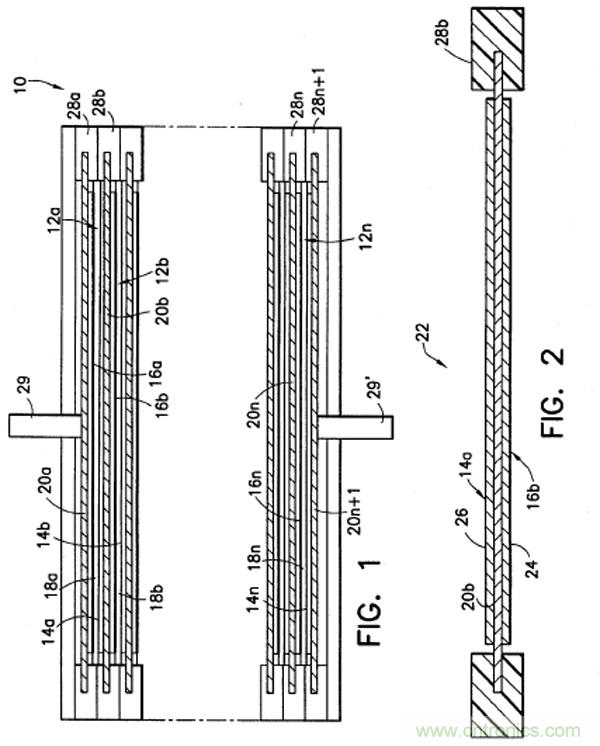 雙極性電極的研究早在二、三十年以前就已經出現。例如在20實際九十年代,美國雅迪尼(Yardney)技術公司就對雙極鋰離子電池展開了研究。雙極性電池設計可以將單元電池cell-stack中相鄰cell之間的電阻最小化,使得每個雙極性cell種的正負極活性涂層表面上的電流和電勢達到更加均勻的分布,因此,采用雙極性cell構成的電池具有更高的功率特性。下圖Fig1是一個典型的由多個雙極性電池單元構成的雙極性鋰離子電池截面圖,Fig2是提取出來的其中一個雙極性電池單元。其中,12a、12b,…,12n是電池單元;14a、14b,…,14n是電池單元的正極側;16a、16b,…,16n是電池單元的負極側;18a、18b,…,18n隔膜;20b、20c,…,20n是集流體(例如,Fig2中的14a和16b共用一個集流體),集流體可采用雙金屬基材,例如,Cu-Al雙金屬,負極活性物質涂敷在Cu側,正極活性物質涂敷在Al側;24是負極活性物質,26是正極活性物質;28a、28b,…,28n是絕緣性連接固定結構,每個雙極性電極通過該連接結構固定起來。在Fig1和Fig2中,一共有n-1個雙極性電極(集流體兩側分別有正極、負極活性物質),最上層20a只有負極一側,另一側跟負極極柱29相連,最下層20n+1只有正極一側,另一側跟正極極柱29相連。