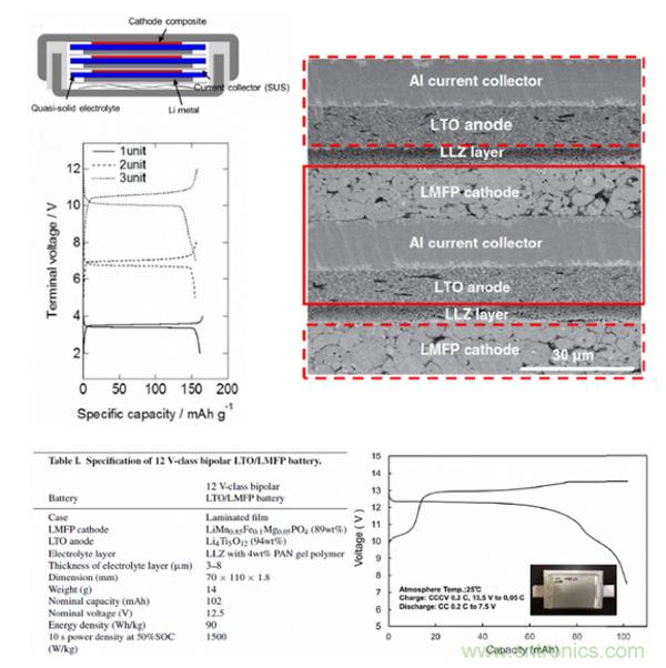 下圖是含有三個雙極性電極的CR2032鈕扣電池。正極是LFP,負極是金屬鋰,采用準固態聚合物電解質和不銹鋼集流體。從電壓曲線可以看到,只要改變雙極性電極的unit數量,就能改變電池的電壓,這里給的分別是1unit、2units、3units的電壓曲線。例如,很容易通過5個雙極性的unit實現一個12V的鋰離子電池,下圖右側是日本東芝公司的一個12V雙極性電池的部分截面圖,從表1的參數中可以看到,這里正極材料是LiMn0.85Fe0.1Mg0.05PO4,負極材料是LTO,集流體是Al,固態電解質電解質是Li7La3Zr2O12(LLZ)和PAN。從封裝方式來看,疊片式軟包裝是比較適合雙極性電池的一種方式。