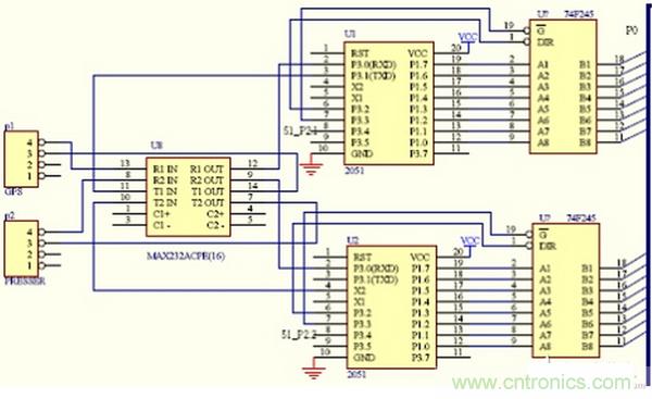 經(jīng)過分析,我們分別使用一塊2051單片機(jī)接收各路串口傳感器的數(shù)據(jù),同時使用一塊多路高精度ADC對轉(zhuǎn)換成電壓的溫度等信號采樣,系統(tǒng)結(jié)構(gòu)圖如圖1所示。主從機(jī)之間的具體管腳連接參見圖2。
