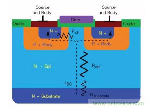 圖1顯示了一種傳統(tǒng)平面式高壓MOSFET的簡單結構。平面式MOSFET通常具有高單位芯片面積漏源導通電阻,并伴隨相對更高的漏源電阻。使用高單元密度和大管芯尺寸可實現(xiàn)較低的RDS(on)值。但大單元密度和管芯尺寸還伴隨高柵極和輸出電荷,這會增加開關損耗和成本。另外還存在對于總硅片電阻能夠達到多低的限制。器件的總RDS(on)可表示為通道、epi和襯底三個分量之和: