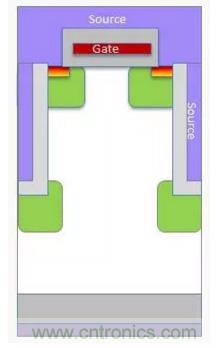 圖2顯示平面式MOSFET情況下構成RDS(on) 的各個分量。對于低壓MOSFET,三個分量是相似的。但隨著額定電壓增加,外延層需要更厚和更輕摻雜,以阻斷高壓。額定電壓每增加一倍,維持相同的RDS(on)所需的面積就增加為原來的五倍以上。對于額定電壓為600V的MOSFET,超過95%的電阻來自外延層。顯然,要想顯著減小RDS(on)的值,就需要找到一種對漂移區(qū)進行重摻雜的方法,并大幅減小epi電阻。