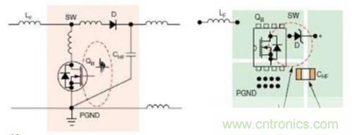 圖4顯示的是升壓轉換器中的連續電流回路與脈沖電流回路。此時,應在靠近MOSFET QB與升壓二極管D的輸出端放置高頻陶瓷電容CHF.