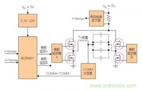 Qi發射器控制器擁有輸入功率限制選項,至發射器的輸入電流可被限制在500mA,從而允許通過USB端口或小型電源適配器供電運行。bq500211發射器的穩壓電路有3.3V的LDO穩壓器構成輸出芯片供電,LDO的最大優勢就是PNP管只會帶來很小的導通壓降,滿載的跌落電壓的典型值小于500mV,輕載時的壓降僅有10~20mV。LDO的壓差為:Vdrop = Vsat (LDO 穩壓器)。
