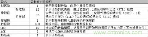 目前使用最廣泛的CAN-bus網絡標準是V2.0版本,該標準又分為A、B兩部分,它們主要的區別在仲裁區域的ID碼長度。其中CAN2.0A(標準幀)為11位ID,CAN2.0B(擴展幀)為29位ID。下表1為CAN報文結構: