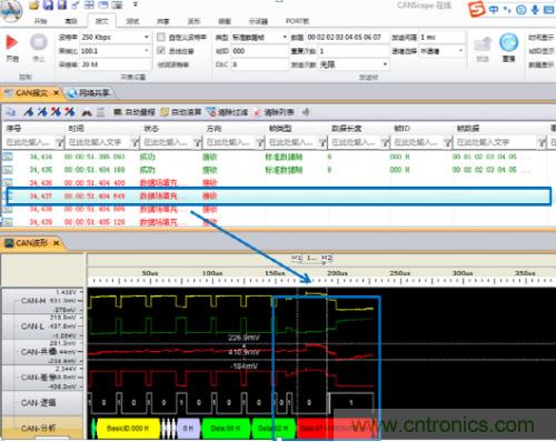 使用一個CAN卡發送ID為000H數據為01020304050607H的CAN幀,使用另一個CAN卡發送ID為000H數據為02020304050607H的CAN幀。CANScope監聽的數據如圖3所示,可以觀察到有大量的數據場填充錯誤。