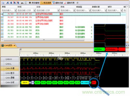 同時使用兩個CAN卡發送ID為000H數據為01020304050607H的CAN幀,CANScope做通信監控。首先,我們不勾選“總線應答”選項,使CANScope工作在僅監聽模式。實驗結果如圖6所示,出現的是應答定界符格式錯誤。
