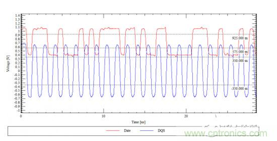 由上圖可知,在地址信號比時鐘信號長的情況下,保持時間為684ps,建立越為1.1ns。可見,相對于地址線與時鐘線等長來說,地址線比時鐘線長會使地址信號的建立時間更短。同理,如果時鐘線比地址線長,則建立時間會變長,而保持時間會變短。那么雙倍速率的數據信號又是怎樣的?下面通過具體的仿真實例來看一下。