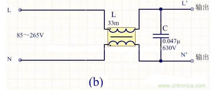 為降低成本和減小體積,開關電源一般采用簡易的EMI濾波器,主要包括共模扼流圈L和濾波電容,以下四種可以根據情況進行選擇:
