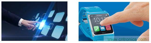 電容式觸摸顯示屏 ─觸摸顯示屏為中型及大型的物聯網設備提供豐富的用戶界面。從微波爐到手持式醫療設備,從智能手表到工業控制器等等。通常,使用電容觸摸技術結合顯示屏上透明的銦錫氧化物層(ITO)來實現觸摸顯示屏。依據這種應用方式,電容式觸控技術要求能夠在潮濕的環境下工作。