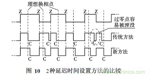 當三相反電動勢波形的間隔時間長度不是理圖11 新的延遲時間設置方法想的120°電角度,過零點間隔時間不相等時,采用新的延遲時間設置方法可以使換相更為準確,換相點落在前后2個過零點的中間位置,過零點不容易被湮沒,電機運行不易失步,如圖10所示. 特別是在電機高速運行時,新方法提高了電機運行的可靠性,實驗很好地驗證了新方法的可行性和有效性.