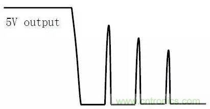 在輸出空載或輕載時(shí),關(guān)閉輸入電壓,輸出(如5V)可能會(huì)出現(xiàn)如下圖所示的電壓反跳的波形。