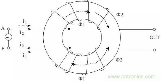 如圖所示,在同一磁環上繞上兩組方向相反的線圈,據右手螺旋管定則可知,當在輸入端A、B兩端加上極性相反,信號幅值相同的差模電壓時,有實線所示的電流i2,在磁芯中產生實線所示的磁通Φ2,只要保證兩繞組完全對稱,則磁芯中兩不同方向之磁通相互抵消。總磁通為零,線圈電感幾乎為零,對常模信號無阻抗作用。若在輸入端A、B兩端加上極性相同,幅值相等的共模信號時,有虛線所示的電流i1,在磁芯中產生虛線所示的磁通Φ1,則磁芯中磁通有相同的方向而互相加強,使每一線圈的電感值為單獨存在時的兩倍,而XL =ωL,因此,此一繞法的線圈對共模干擾有很強的抑制作用。