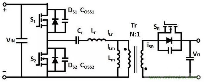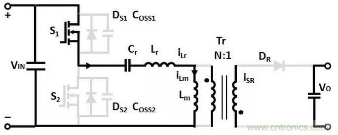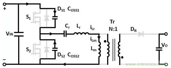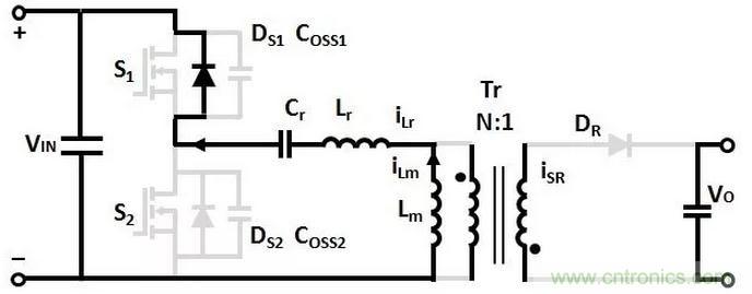 T1時(shí)刻,S1關(guān)斷,(Coss1+Coss2)和(Lr+Lm)諧振,Coss1充電,Coss2放電,直到T2時(shí)刻,Coss1的電壓充電到VIN,Coss2的電壓放電到0。