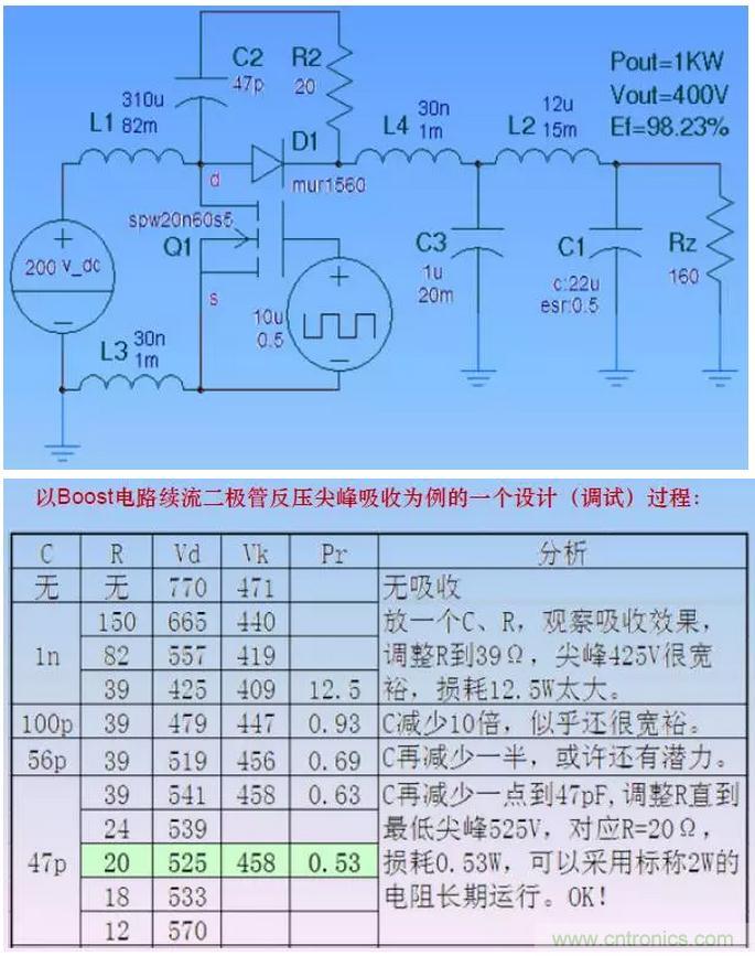 將開關管Q1、拓撲續流二極管D1和一個無損的拓撲電容C2組成一個在布線上盡可能簡短的吸收回路。