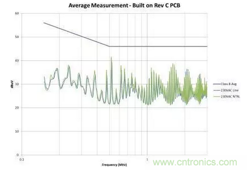 圖4是修改后的效果圖。我們在故障點位置為EMI規范獲得了大約6dB的裕量。此外,我們還顯著減少了總體EMI簽名。所有這些改善都僅僅是因為布局的調整,并未改變電路。如果您的電路具有高電壓開關并使用了屏蔽距離,您需要非常小心地對其進行控制。