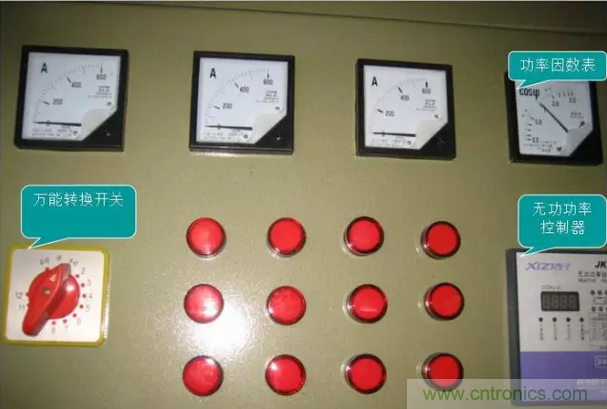 三個電流表A、一個功率因數表COS;功率控制器PK;萬能轉換開關
