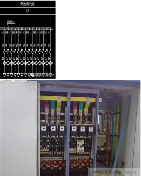 每組出線有:一個電流表;一個塑殼斷路器;一個電流互感器