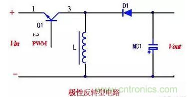 如下圖為極性反轉型電路,也叫倒置型電路。當Q1導通時,uin加在l兩端,產生電流和儲存能量。Q1截止后,l上的電流經二極管D1給電容器MC1充電。由此產生與輸人電壓極性相反的輸出電壓。