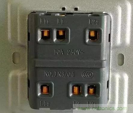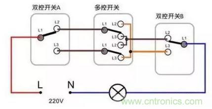 這里要新介紹一個開關,叫做三控開關。開關布置的順序是,單開雙控→三控開關→單開雙控。先看個三控開關的圖,能更好理解,如下: