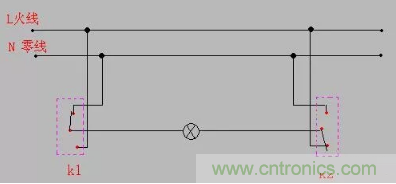 不管幾個開關控制一個燈,都是開關控制火線的通斷,所以零線是直接接燈的。這種是最常規的接法,兩個單聯雙控開關的L一個接火線一個接燈的控制線,兩個開關上的L1和L2同名的連一起。