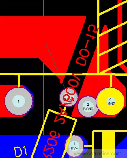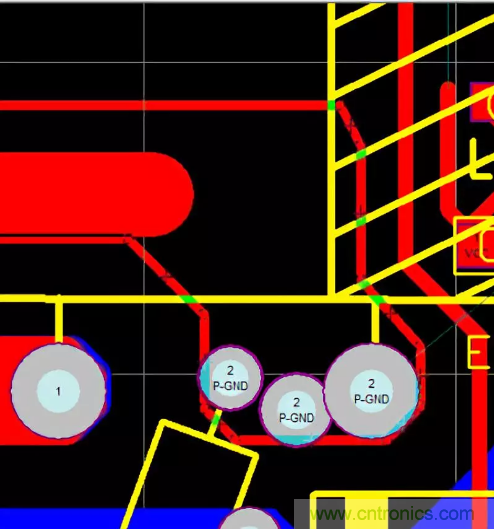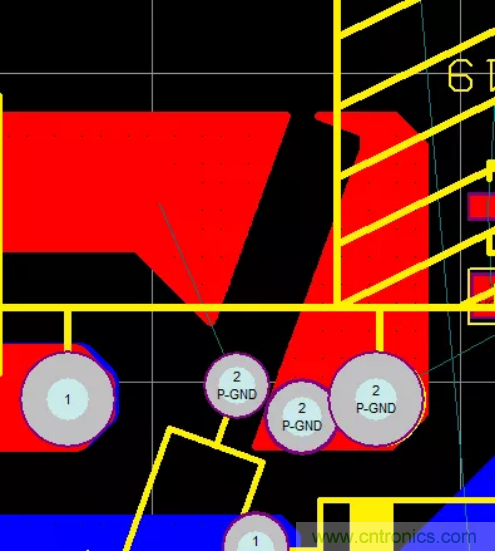 47.PCB的熱點區域一定要遠離輸入、輸出端子,防止噪聲源串到線上導致EMI變差,在不得已而為之時,可增加地線或其它屏蔽方式進行隔離,如下圖增加了一條地線進行有效隔離。