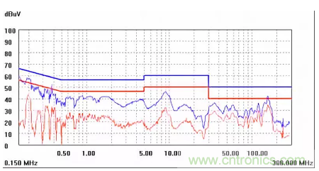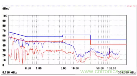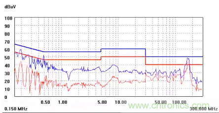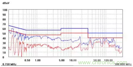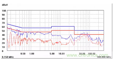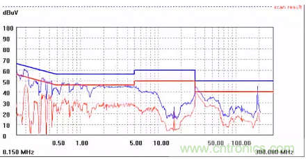 圖一a可以看出,改變PCB布局后130M-200M已經完全被衰減,但是30-130M沒有圖一效果好,可能變壓器出線無交叉好一些。仔細觀察,此IC具有抖頻功能,傳導部分頻段削掉了一些尖峰;
