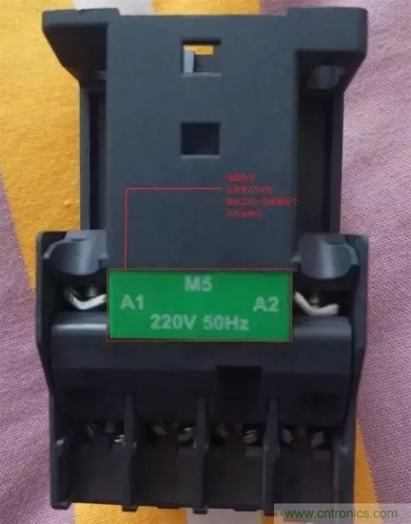 每一件接觸器在線圈接線端子地方都會有這樣的標識,還請各位一定要注意,接錯了這個線圈就廢了。。
