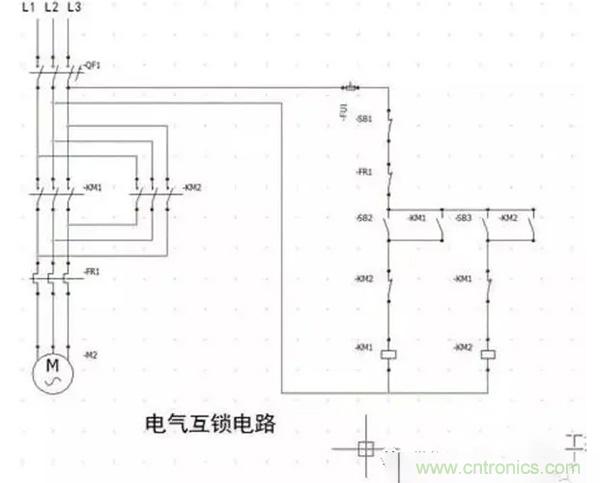 正反轉(zhuǎn)的控制回路只是在KM1的正轉(zhuǎn)回路上增加了一個KM2的常閉輔助觸點,同時也在KM2的反轉(zhuǎn)回路上增加了一個KM1的常閉輔助觸點,這就是所謂的互鎖電路