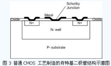 在一般的無源UHF RFID 標(biāo)簽的應(yīng)用中,出于成本的考慮,希望芯片電路適合于普通CMOS工藝的制造。而遠(yuǎn)距離讀寫的要求對電源恢復(fù)電路的功率轉(zhuǎn)換效率提出了較高的要求。為此,很多設(shè)計(jì)者采用標(biāo)準(zhǔn)CMOS 工藝來實(shí)現(xiàn)肖特基勢壘二極管,從而可以方便地采用多級Dickson倍壓電路結(jié)構(gòu)來提高電源轉(zhuǎn)換的性能。圖3 所示是普通CMOS 工藝制造的肖特基二極管結(jié)構(gòu)示意圖。在設(shè)計(jì)中,不需要更改工藝步驟和掩膜板生成規(guī)則,只需在版圖上作一些修改,就可以制作出肖特基二極管。