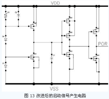 通常,無源RFID 標(biāo)簽進(jìn)入場區(qū)后,電源電壓上升的時間并不確定,有可能很長。這就要求設(shè)計(jì)的啟動信號產(chǎn)生電路產(chǎn)生啟動信號的時刻與電源電壓相關(guān)。圖12 所示是一種常見的啟動信號產(chǎn)生電路。