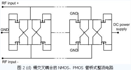 在這些電源恢復(fù)電路中,并不存在最理想的電路結(jié)構(gòu),每種電路都有各自的優(yōu)點(diǎn)及缺陷。在不同的負(fù)載情況、不同的輸入電壓情況、不同的輸出電壓要求以及可用的工藝條件下,需要選擇不同的電路以使其達(dá)到最優(yōu)的性能。圖2(a)所示的多級二極管倍壓電路,一般采用肖特基勢壘二極管。它具有倍壓效率高、輸入信號幅度小的優(yōu)點(diǎn),應(yīng)用十分廣泛。但是,一般代工廠的普通CMOS 工藝不提供肖特基勢壘二極管,在工藝的選擇上會給設(shè)計(jì)者帶來麻煩。圖2(b)是用接成二極管形式的PMOS 管來代替肖特基二極管,避免了工藝上的特殊要求。這種結(jié)構(gòu)的倍壓電路需要有較高的輸入信號幅度,在輸出電壓較高時具有較好倍壓效率。圖2(c)是傳統(tǒng)的二極管全波整流電路。與Dickson 倍壓電路相比,倍壓效果更好,但引入了更多的二極管元件,功率轉(zhuǎn)換效率一般略低于Dickson 倍壓電路。另外,由于它的天線輸入端與芯片地分離,從天線輸入端向芯片看去,是一個電容隔直的全對稱結(jié)構(gòu),避免了芯片地與天線的相互影響,適合于與對稱天線(例如偶極子天線)相接。圖2(d)是許多文獻(xiàn)提出的全波整流電路的CMOS 管解決方案。在工藝受限的情況下,可以獲得較好的功率轉(zhuǎn)換效率,并且對輸入信號幅度的要求也相對較低。