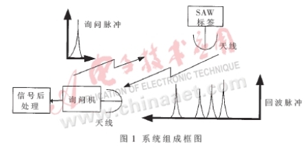 SAW傳感器構(gòu)成的車輛識(shí)別系統(tǒng)由一個(gè)裝載在高速運(yùn)動(dòng)車輛上的SAW傳感器標(biāo)簽、一個(gè)帶主動(dòng)式天線的詢問單元和一個(gè)信號(hào)后處理單元組成。如圖1所示。