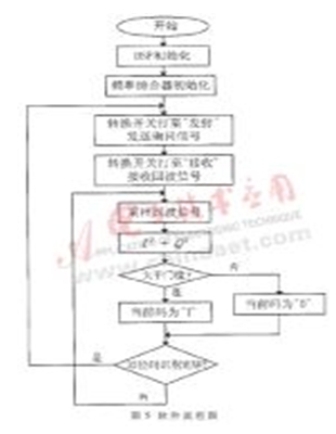 軟件流程如圖5所示。系統(tǒng)開始工作后,DSP初始化,F(xiàn)PGA配置頻率綜合器ADF4127L,產(chǎn)生精準(zhǔn)的頻率源。詢問機(jī)轉(zhuǎn)換開關(guān)指向發(fā)射位置,發(fā)射單元發(fā)射詢問脈沖信號(hào),經(jīng)過一段時(shí)間后,開關(guān)指向接收位置,接收單元接收回波信號(hào),先進(jìn)行A/D采樣,并將I路和Q路的采樣值平方相加,若大于編碼門限,則判定當(dāng)前碼為1,否則為0。一幀32位識(shí)別碼判別完后,詢問單元重新發(fā)出詢問信號(hào),如此循環(huán)。解調(diào)出的識(shí)別碼通過串口送給外部設(shè)備,以供處理。