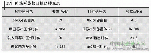 因?yàn)榻K端網(wǎng)絡(luò)接口板上沒有412.5 MHz和577.5 MHz這兩個頻率信號,所以懷疑這兩個頻點(diǎn)可能是某些頻率信號的諧波分量。高速電路中,時鐘電流是第一輻射源。筆者對終端網(wǎng)絡(luò)接口板上的各時鐘信號進(jìn)行了統(tǒng)計(jì),如表1所示。