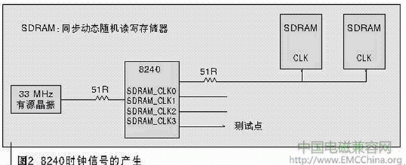 圖2所示為8240時鐘信號的產(chǎn)生原理圖。8240外部有源晶振產(chǎn)生33 MHz的振蕩頻率,送入8240芯片,經(jīng)內(nèi)部PLL(鎖相環(huán))鎖相倍頻,輸出83.3 MHz頻率,作為SDRAM(同步動態(tài)隨機(jī)讀寫存儲器)的工作時鐘,8240有4個引腳可以同時送出該83.3 MHz的時鐘:SDRAM_CLK0~SDRAM_CLK3,而且可以在8240內(nèi)部寄存器中設(shè)置開關(guān)。該單板在電路設(shè)計(jì)時,使用SDRAM_CLK0作為SDRAM工作時鐘,另一路SDRAM_CLK3送至一測試點(diǎn),方便調(diào)試時測量時鐘信號,其余2路設(shè)置為關(guān)閉狀態(tài),不對外輸出時鐘。