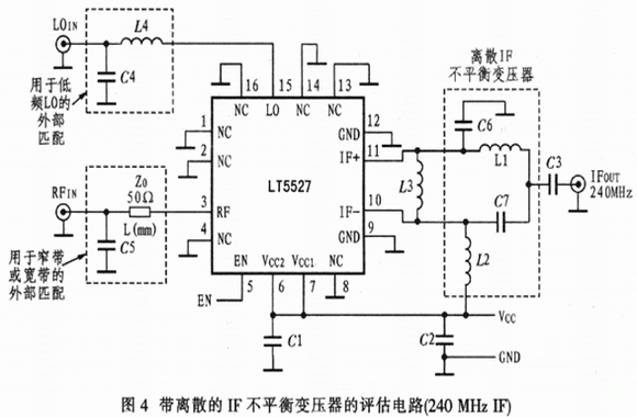 圖3示出由混合變壓器構成的lF匹配電路,以達到最低LO-IF泄漏和最寬的IF帶寬。圖4示出由1個離散的IF不平衡變壓器代替IF變壓器的電路,以降低成本和縮小尺寸,盡管離散的IF不平衡變壓器也有較理想的噪聲系數、線性度及較高的轉換增益,但是LO-IF泄漏降低,IF的帶寬減小。