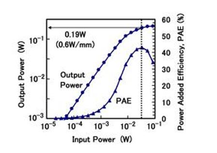 富士通通過(guò)使用45nm工藝技術(shù)把新型晶體管技術(shù)應(yīng)用到3.3 V I/O的標(biāo)準(zhǔn)晶體管上,從而開(kāi)發(fā)出了世界上首個(gè)能把擊穿電壓從6 V 提高到 10 V的晶體管。新型晶體管適用于功率放大器,它在最大振蕩頻率為43 GHz (圖2)時(shí)每個(gè)1mm門極寬度能夠輸出0.6 W(0.6 W/mm),展示了其作為功率放大器在面向WiMAX等高頻應(yīng)用方面的卓越性能。新型晶體管在基本的可靠性測(cè)試上也取得了良好的測(cè)試結(jié)果。
