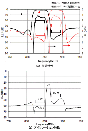舉例來說,圖1所示的是BAND5(800MHz )收發(fā)雙工器(產(chǎn)品尺寸2.5×2.0×0.6mm)的傳輸特性以及隔離度。一般的隔離度和過濾性的損耗是相互制約的關(guān)系,但本產(chǎn)品對于Tx頻段能實現(xiàn)60dB的高隔離度,同時使Rx損耗維持在1.8dB。
