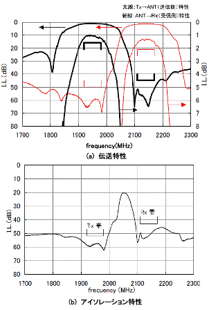 第二個例子,以圖2的BAND1(2GHz)收發(fā)雙工器(產(chǎn)品尺寸3.0×2.5×1.1mm)的特性為例。將特殊的設(shè)計技術(shù)引入到表面波難以實現(xiàn)低損耗的BAND1(2GHz)中來,在得到實際使用所需的隔離度的同時,還能實現(xiàn)Tx損耗1.4dB 和Rx損耗1.8dB這樣杰出的低損耗特性。一直以來,介質(zhì)收發(fā)雙工器在BAND1(2GHz)頻帶曾一度占據(jù)了主流的地位,而目前表面波做到了不亞于它的損耗值。由此,表面波收發(fā)雙工器替代了介質(zhì)收發(fā)雙工器成為了當(dāng)今主流。