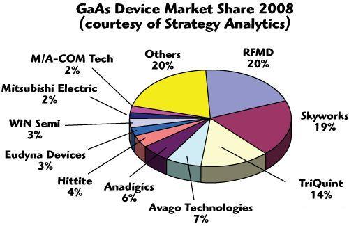 經(jīng)過多年的發(fā)展,GaAs供應(yīng)商已經(jīng)形成了穩(wěn)定的市場格局,由于GaAs產(chǎn)品與工藝關(guān)系非常大,大部分廠商都有自己的工廠。下圖是經(jīng)濟危機開始時2008年GaAs市場占有率情況。