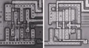 圖2:NAND門(mén)驅(qū)動(dòng)一個(gè)反向器的光學(xué)照片(包含金屬層和去掉金屬層)。