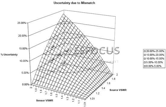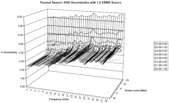 該圖顯示了熱電堆傳感器在其整個工作頻率范圍內(nèi)的不確定性表面。在該情形下,信號源匹配一直固定在1.2,所以由于不匹配引起的不確定性被減小了。不確定性已經(jīng)被當(dāng)作RSS項疊加。在低功率電平上不確定性的增加主要是由零位調(diào)整參數(shù)引起的。這種與頻率相關(guān)的紋波是因在整個范圍內(nèi)變化的校正因子的不確定性引起的。