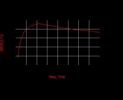 由于高頻段(DCS)的增益在第二和第三級時略低,因此設計第一級放大電路時,DCS頻段第一級增益比GSM頻段第一級高約3dB。同時,在DCS 頻段射頻輸入端加入濾波網絡,如圖2所示。此濾波網絡對GSM頻段信號起到帶阻作用,同時對DCS頻段信號起到帶通作用,加入此濾波網絡可有效地提高交叉隔離度。該濾波網絡的仿真原理圖與仿真結果分別如圖4、圖5所示。本設計電路GSM頻段和DCS頻段總增益仿真結果如圖6、圖7所示。