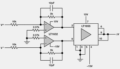 盡管共模信號(H橋的電源電壓)很大,由于這些放大器具有高共模抑制特性,因此仍可精確測量電壓和電流。LT1632逆變器將電壓信號衰減至LT1995的輸入共模范圍內。共同使用LT1632s和LT1995產生的輸出電壓ΔV是負載電壓的0.1倍。