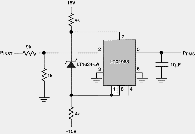 瞬時功率波形衰減十倍,并輸入到LTC1968,這樣直流輸出與RMS功率成正比(圖5)。