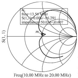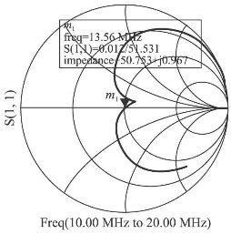手動(dòng)調(diào)諧即是交替不斷調(diào)整電容C1、C2 的值,同時(shí)觀察曲線變化,直到在所要求的頻率點(diǎn)S11等于0。圖2為某一天線電路在頻率在10~20MHz之間變化時(shí),其反射系數(shù)的變化曲線,其中,標(biāo)記13. 56MHz的點(diǎn), S11值近似為0,達(dá)到了匹配要求。