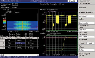 預(yù)編程測量能減少進行這些測試所需的建立時間。例如,ISO18000-6 C 類型的一個重要測量是啟動時間和關(guān)閉時間。載波能量上升時間必須足夠快以保證標簽采集到使其正常工作的充足能量。信號也必須迅速達到穩(wěn)定狀態(tài)。發(fā)射結(jié)束時,載波能量下降時間必須足夠快,以防止其他發(fā)射受到干擾 [參閱圖3]。