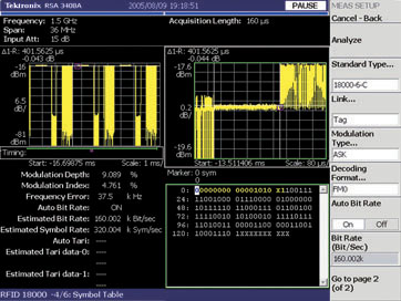 RTSA 也能解調(diào)與標簽查詢相關(guān)的符號或比特。用戶只需選擇相應(yīng)的 RFID 標準、調(diào)制類型和解碼格式。分析儀能自動檢測并顯示鏈路的比特率。為進一步提高工程師的生產(chǎn)效率,對恢復(fù)出的數(shù)據(jù)符號進行了基于功能的顏色編碼(color-coded)。RTSA 能夠自動識別前導(dǎo)符并將那些符號染成黃色。這易于識別實際的數(shù)據(jù)負荷并與已知值進行比較。