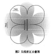 由于環形天線的電磁場在其臨近區域分布不均勻,因此會出現讀寫盲區。如圖2中黑線勾勒出的范圍之外區域一般為單個天線的讀寫盲區。經反復實驗證明將電子標簽擺放位置轉到與最佳位置成40°角區域時,一般可正常讀寫操作。